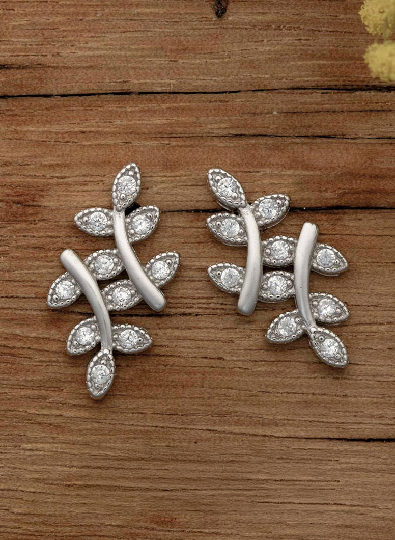 Sterling Silver Leaf Push-back Earrings Decorated with CZ Simulated Diamonds ... Show more